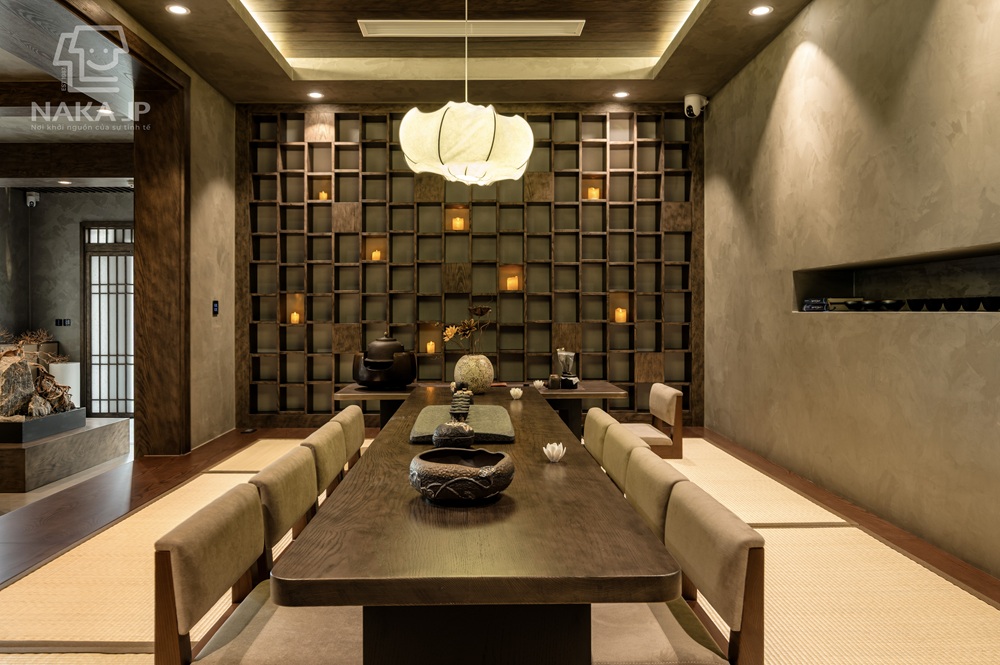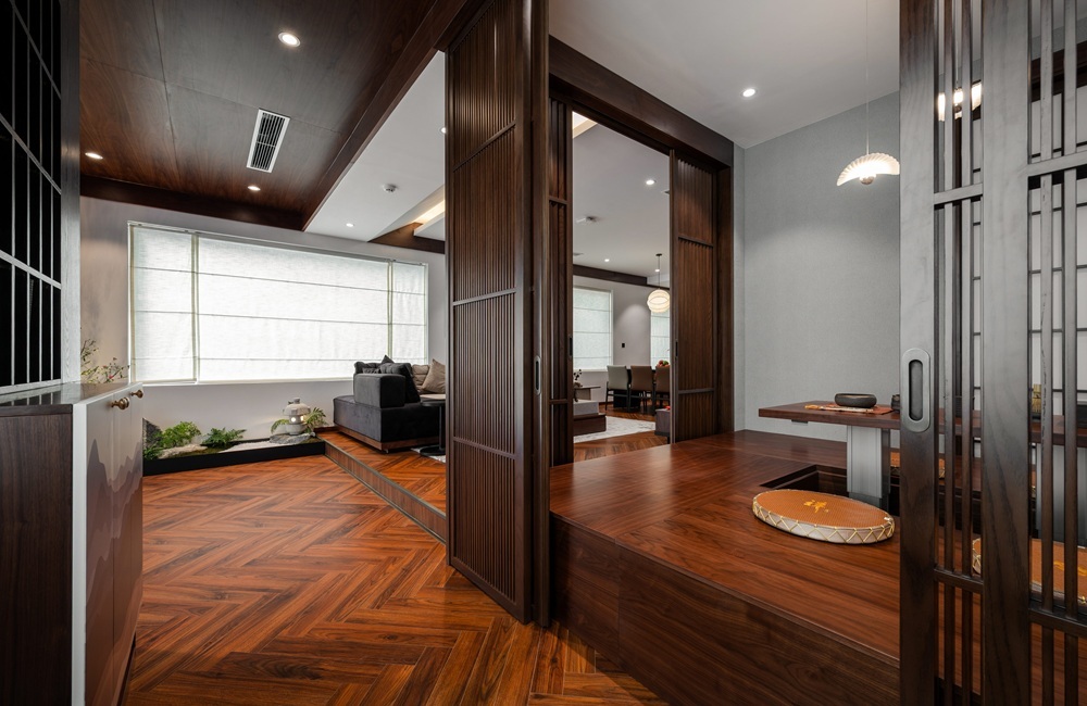 Tỉ lệ giữa các khu vực chức năng như phòng khách, phòng trà, hành lang, hiên nhà hay sân vườn luôn được tính toán để tạo ra sự chuyển tiếp mềm mại. Không gian không bị chia cắt cứng nhắc mà liên kết với nhau thông qua cửa trượt, vách ngăn nhẹ và khoảng đệm. Nhờ đó, tổng thể công trình luôn giữ được nhịp điệu cân bằng, không thừa cũng không thiếu.